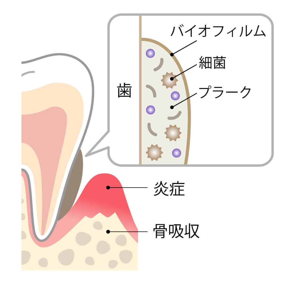 歯周病の原因であるプラーク(歯垢)の中で歯周病菌が増殖し、歯と歯ぐきの間にある歯周ポケットに入り込み毒素を出しながら周囲の歯周組織を破壊していきます。