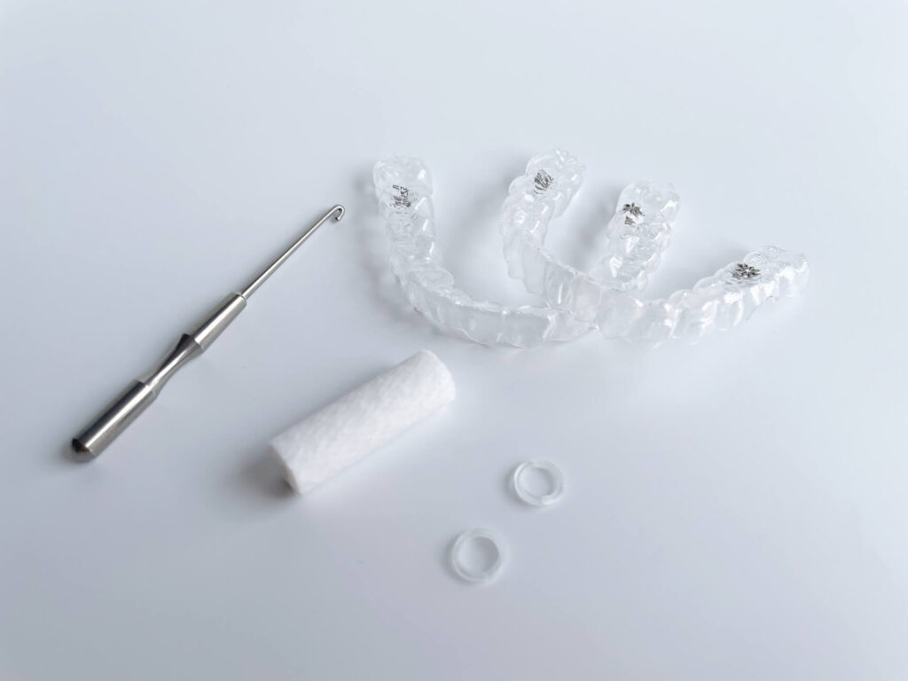 アライナーだけでは歯を個々に動かすことは得意でも、上下の顎の位置を調整することは難しい場合があり、顎間ゴムを併用することで、前後のズレや噛み合わせの高さを整え、最終的に理想的な咬合に導くことができるのです。
