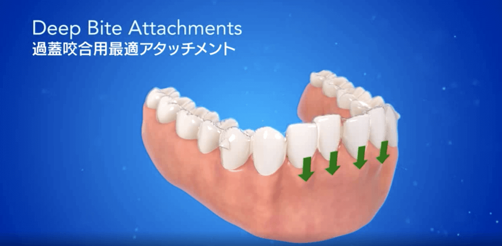 噛み合わせが深い過蓋咬合の人には「ディープバイト用最適アタッチメント」など、不正咬合に合わせたアタッチメントを選択していきます。